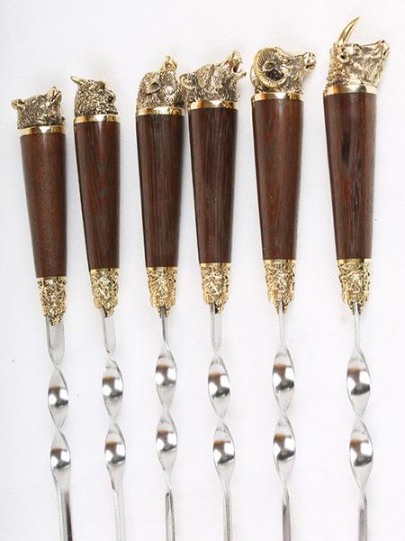 Красивые и практичные шампуры выполнены из пищевой нержавеющей стали толщиной 2–3 мм с декоративными элементами в технике художественного литья. Рукоять удобна, не нагревается и легко моется, а наконечники защищают от повреждений. Набор отлично подойдет для приготовления мяса, рыбы и овощей на природе.