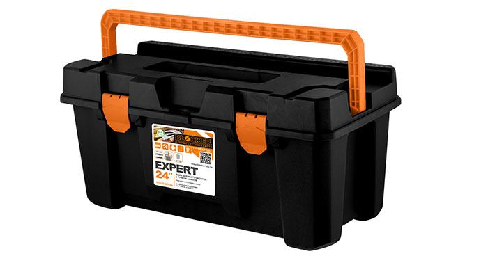 Ящики для инструментов Blocker Expert (18", 20", 24") – прочные, с ручкой-замком, ложементом для распила, линейкой и съемным лотком-органайзером. Возможна установка навесного замка.